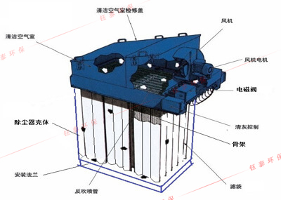 含塵空氣由風(fēng)口進(jìn)入除塵器箱體內(nèi),細(xì)小塵粒由于濾袋的多種效應(yīng)作用,被滯阻在濾袋外壁。凈化后的氣體通過濾袋從上箱體出風(fēng)口排出。隨著使用時(shí)間的增長,濾袋表面吸附的粉塵增多,濾袋的透氣性減弱,使除塵器阻力不斷增大。為保證除塵器的阻力控制在限定的范圍之內(nèi),由脈沖控制儀發(fā)出信號,循序打開電磁脈沖閥,使氣包內(nèi)的壓縮空氣由噴吹管各噴射到對應(yīng)的骨架(稱為一次風(fēng)),并在高速氣流通過骨架時(shí)誘導(dǎo)數(shù)倍于一次風(fēng)的周圍空氣(稱為二次風(fēng))進(jìn)入濾袋,造成濾袋瞬間急劇膨脹,由于反向脈沖氣流的沖擊作用很快消失,濾袋又急劇收縮,這樣使積附在濾袋外壁上的粉塵被清除。由于清灰是依次分別向幾組濾袋進(jìn)行,并不切斷需要處理的含塵空氣,所以在清灰過程中,除塵器的處理能力保持不變。