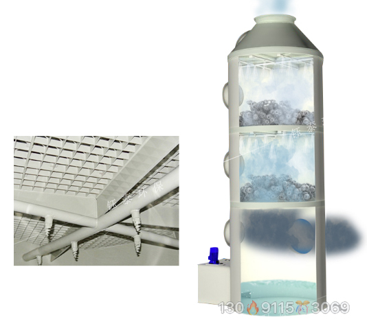 廢氣噴淋凈化塔的工作原理是將氣體中的污染物分離成無害物質,以達到凈化氣體的目的,屬于差動接觸逆流,塔體填料是氣液接觸的基本組成部分。進入塔體的氣體進入塔體后,氣體進入填料層