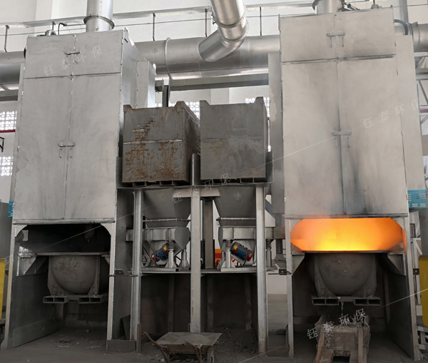 將熔煉爐中鋁灰扒出,盛入鋁灰機專用的鍋中,通過設備攪拌,將比重不同的金屬鋁和熱殘灰分離。在對高溫鋁灰進行攪拌的這個過程是粉塵最為嚴重的時候,此時炒灰機配套的55KW除塵器需要滿負荷運轉,以達到最佳除塵狀態。1套鋁灰處理煙氣處理系統,單獨為炒灰機設置的除塵器,處理風量約為45000m³/h。